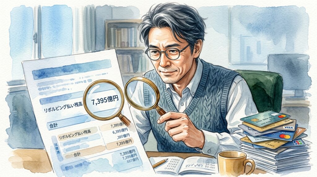 リボ払いの金利はわかっているので(年利15%!!!)、楽天が抱えているリボ払い残高(楽天にとっては資産)がわかれば、年間の収入が大体わかります。